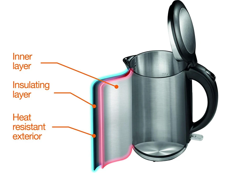 Підвійна стінка забезпечує кращу ізоляцію та довше зберігає воду гарячою. Крім того, завдяки їй силікон не потрапляє всередину, а також знижується температура чайника ззовні, коли в ньому кип'яток або гаряча вода.