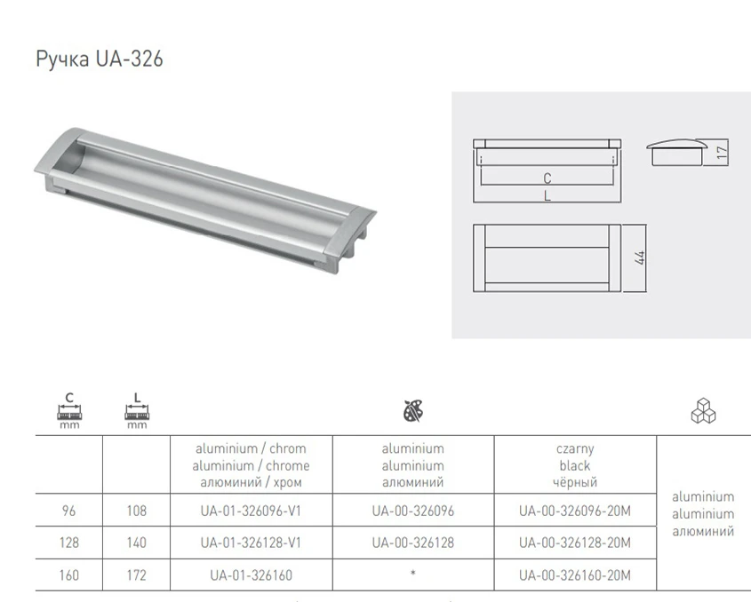 - Ширина, мм Ручка меблева 17