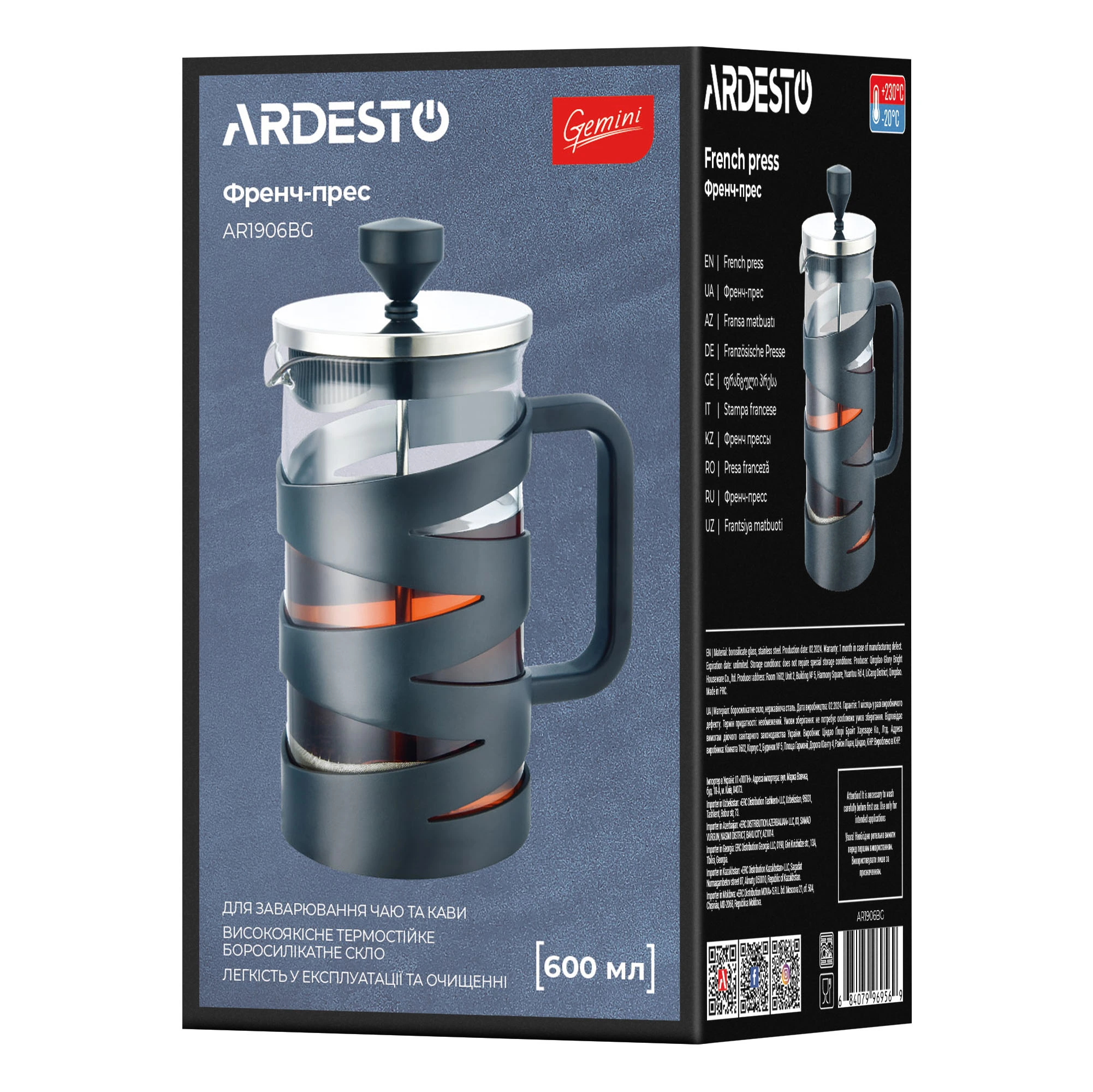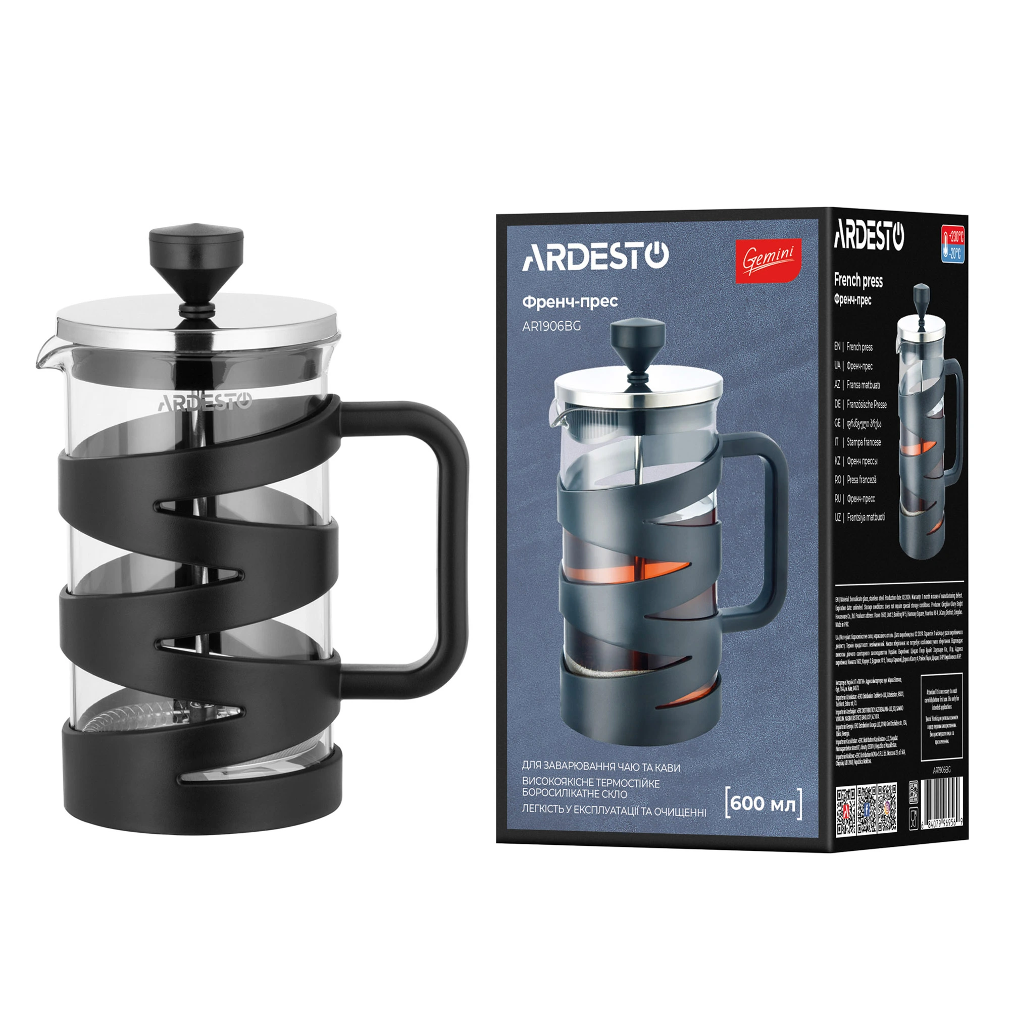 Френч-прес Ardesto Gemini, 600мл, боросилікатне скло, пластик, нержавіюча сталь, прозорий, чорний