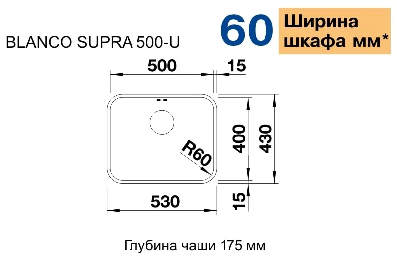 Мийка з нержавіючої сталі BLANCOSUPRA 500-U (518205) без клапана-автомата для монтажу під стільницю. Виконана в класичному дизайні, що не виходить з моди.