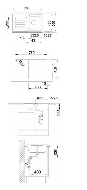 * *Враховувати ширину пристінного канта у разі встановлення мийки біля стіни або пеналу