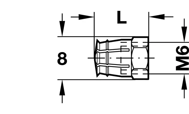 Розпірна муфта для з внутрішньою різьбою М6, виготовлена з латуні. Муфта для отвору діаметром 8 мм, довжина розпірної муфти 12 мм.