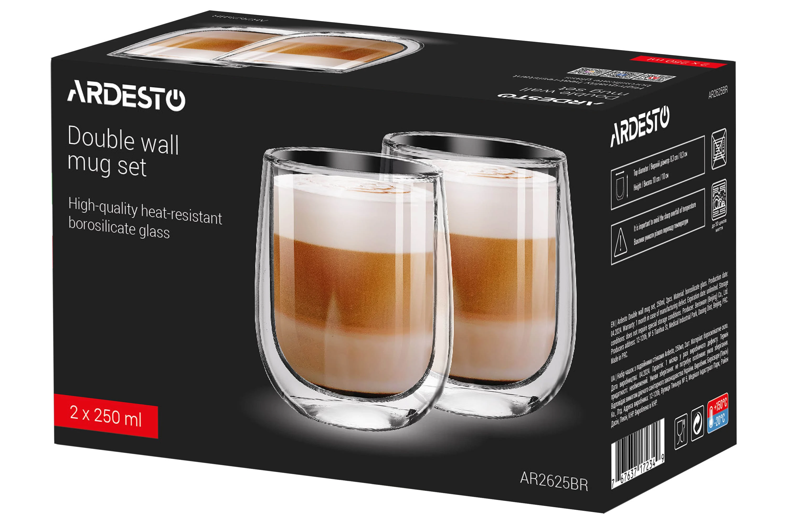Набір чашок з подвійними стінками. До набору входять дві чашки об’ємом по 250 мл. Чашки виготовлено з термостійкого боросилікатного скла.