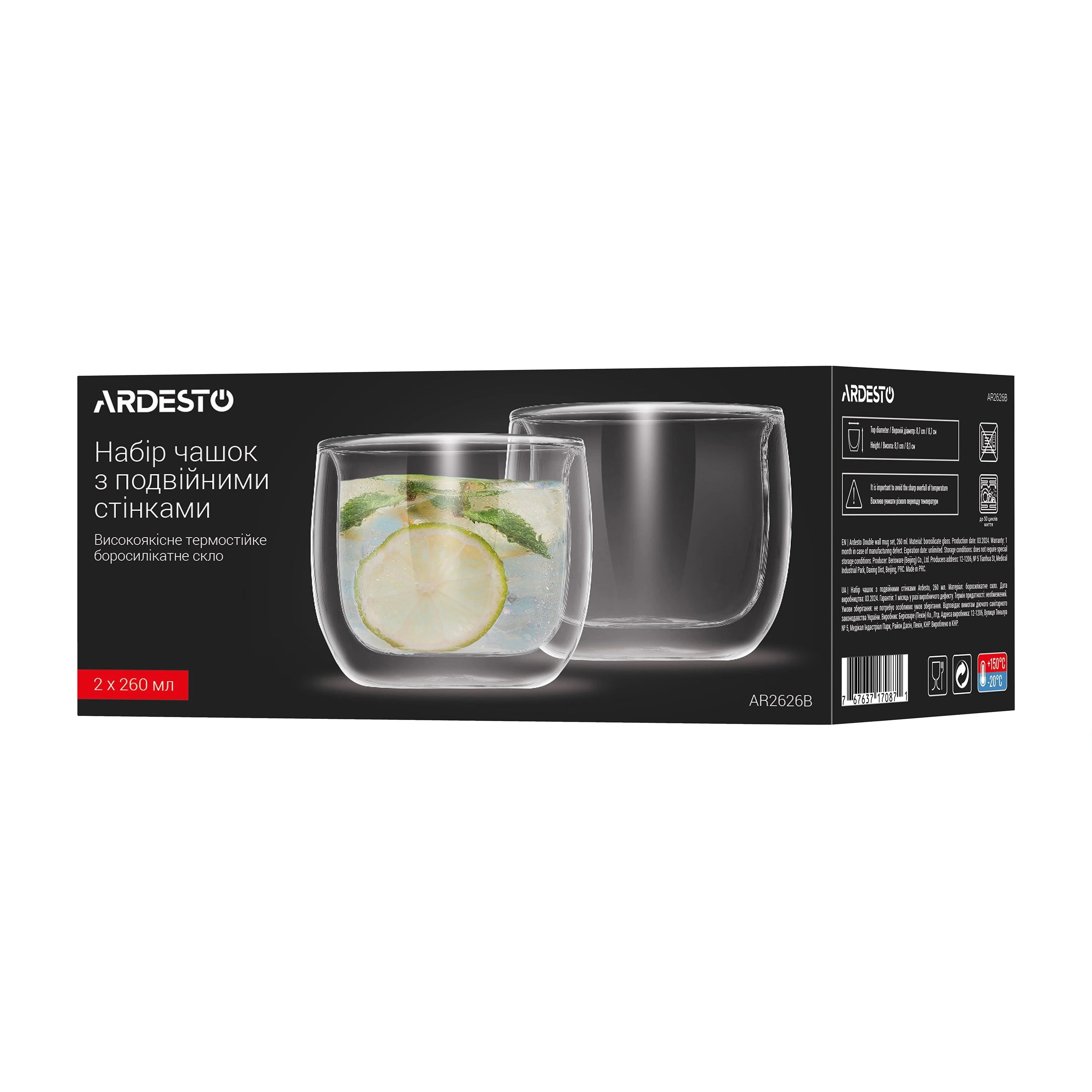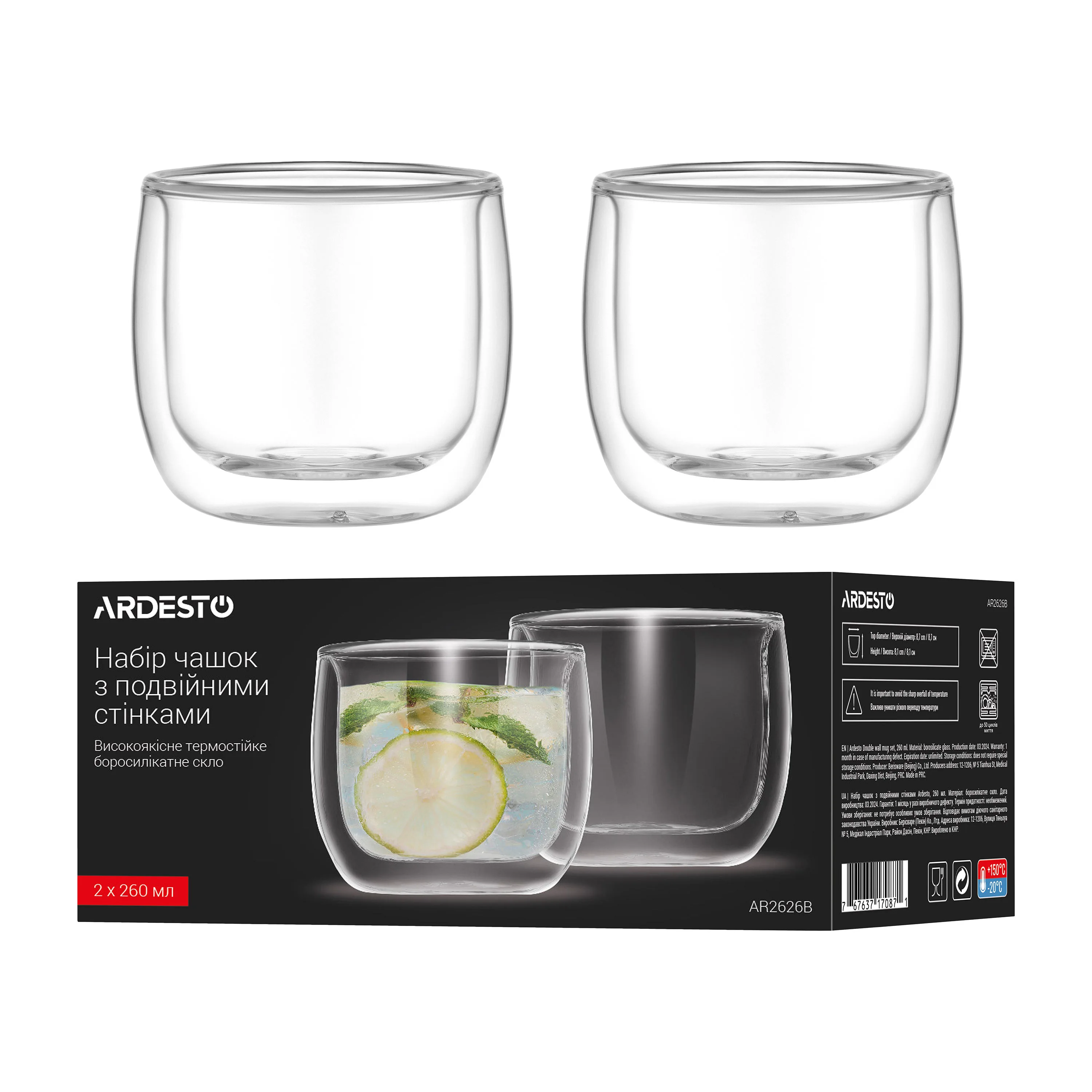 Набір чашок з подвійними стінками Ardesto, 260мл, 2шт, боросилікатне скло, прозорий