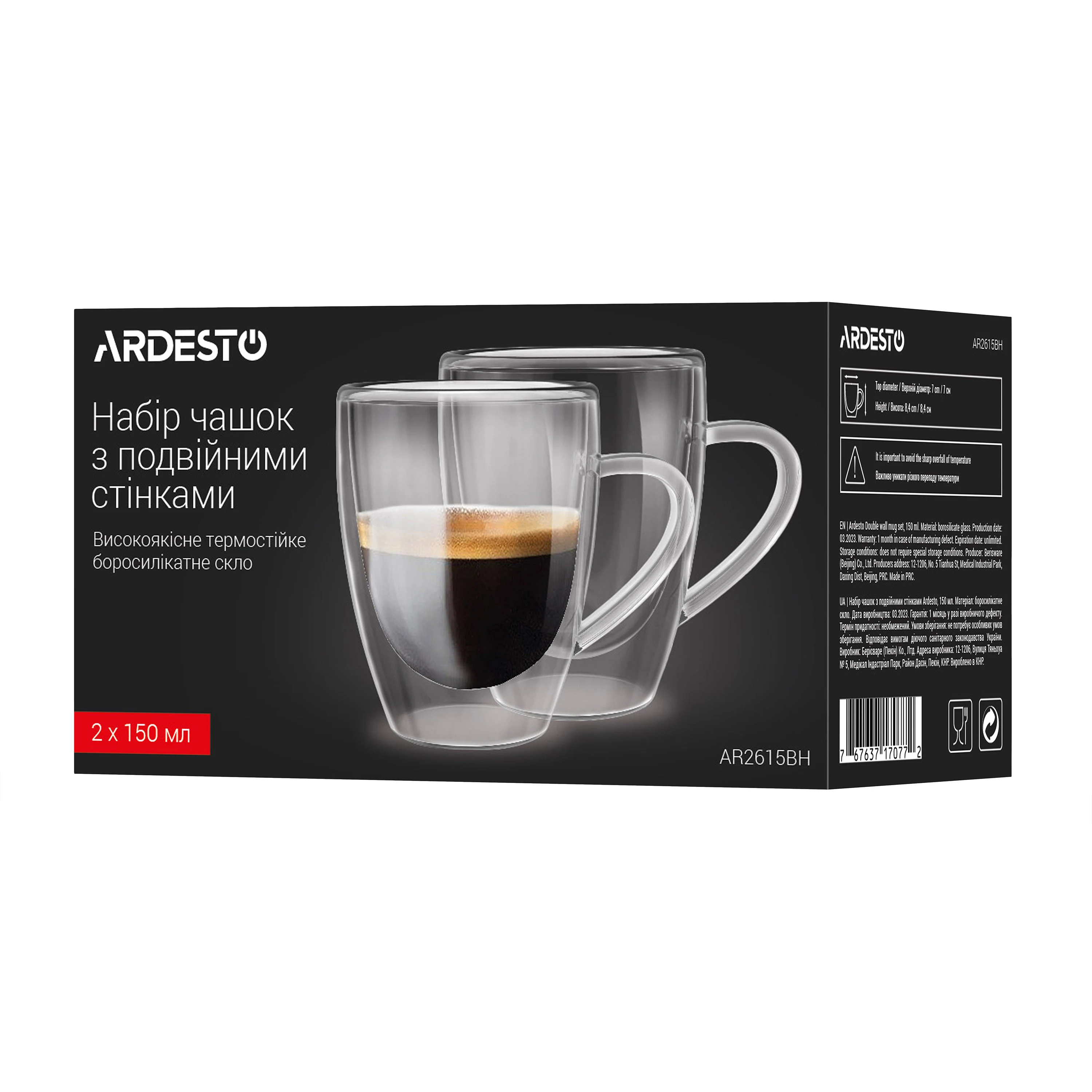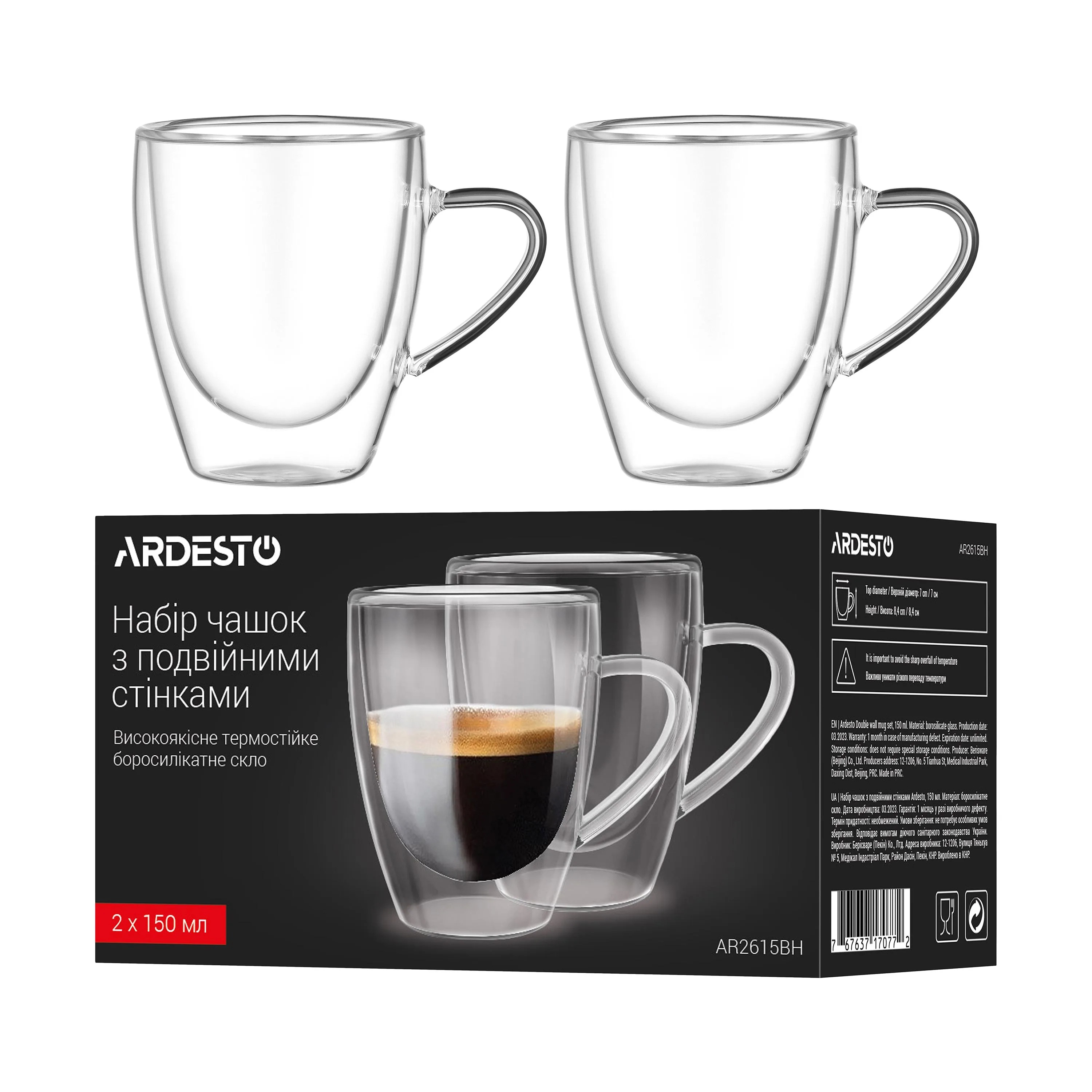 Набір чашок з ручками і подвійними стінками Ardesto, 150мл, 2шт, боросилікатне скло, прозорий