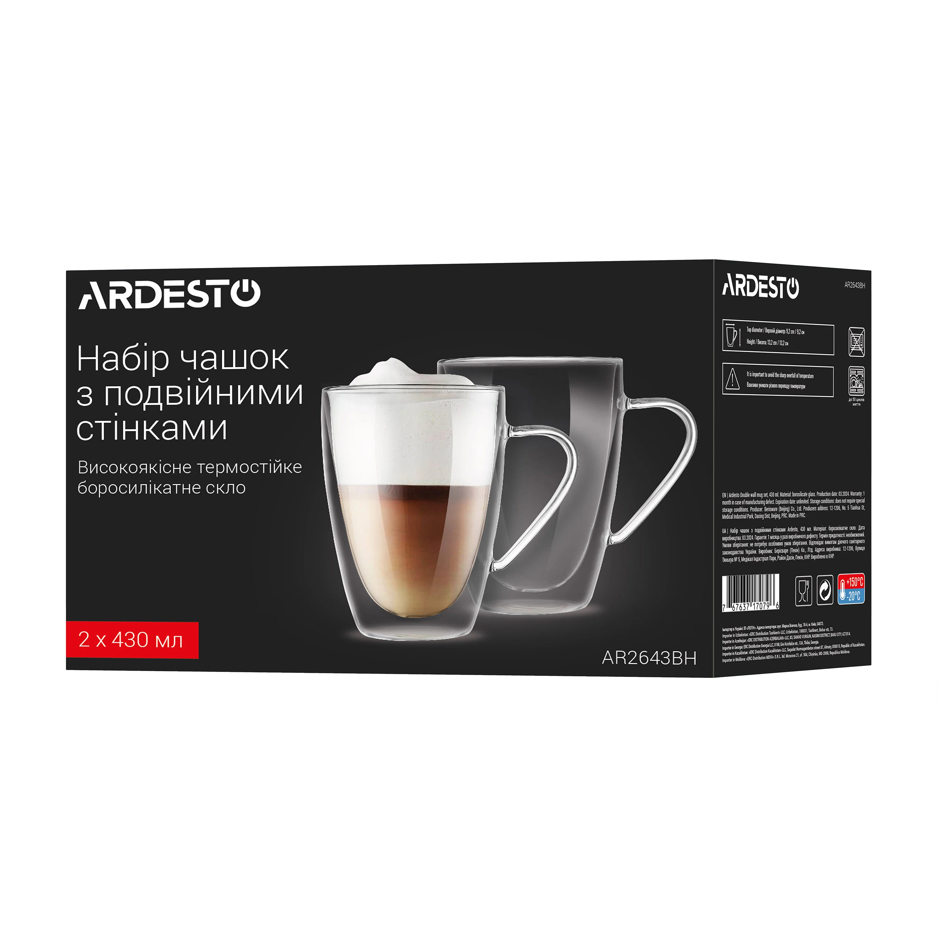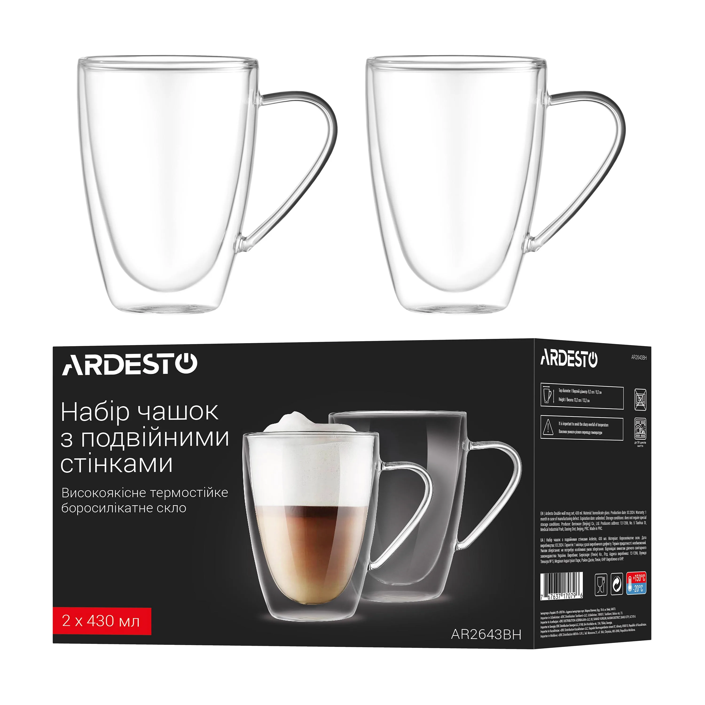 Набір чашок з ручками і подвійними стінками Ardesto, 430мл, 2шт, боросилікатне скло, прозорий