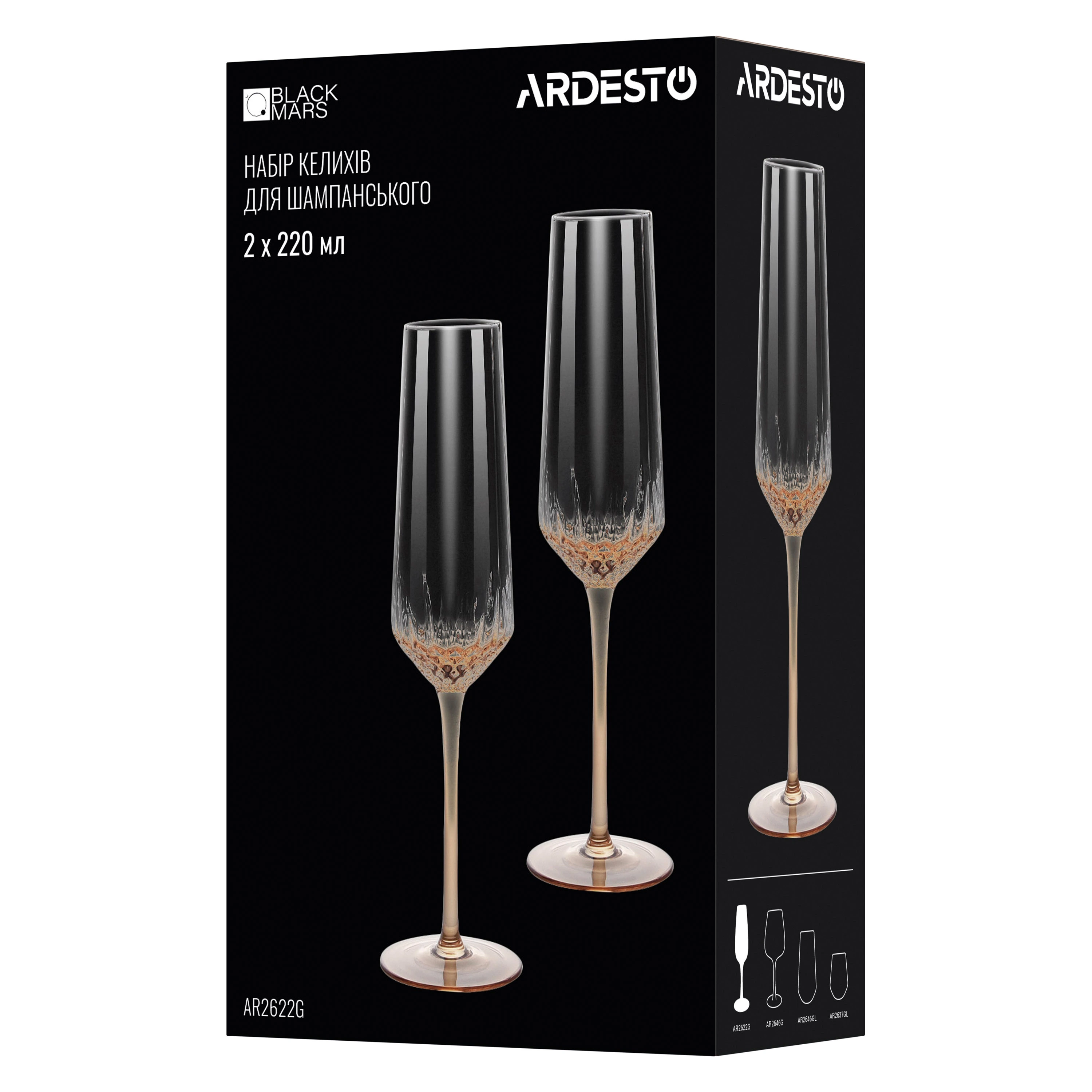 Набір келихів для шампанського Ardesto Black Mars Favola 220мл, 2шт, скло, прозоро-золотистий