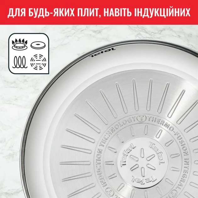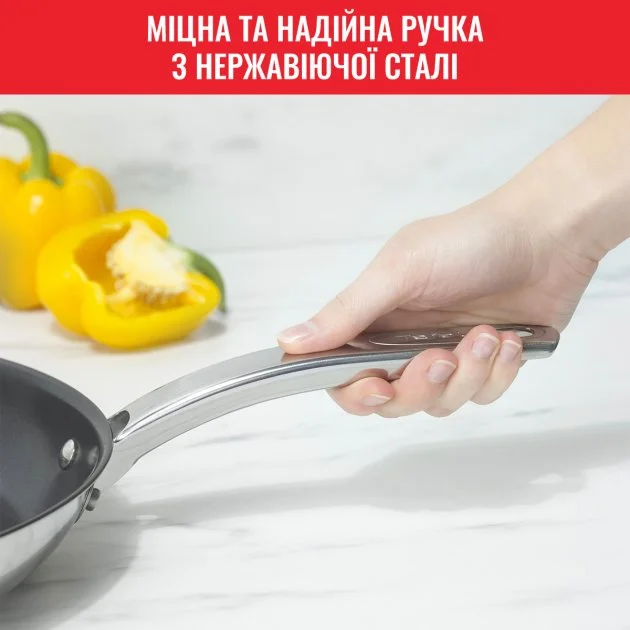 Набір сковорідок Tefal Intuition B817S255 20, 26см, покриття Titanium, індукція, Thermo-Spot, нерж.сталь. Сковорода Tefal Intuition з нержавіючої сталі поєднує стиль і відмінні кулінарні властивості. Ця сковорода, оснащена основними функціями, які спрощують роботу на кухні, виготовлена з високоякісної нержавіючої сталі з гарантією 5 років. А титанове антипригарне покриття забезпечує виняткову міцність для максимальної довговічності.