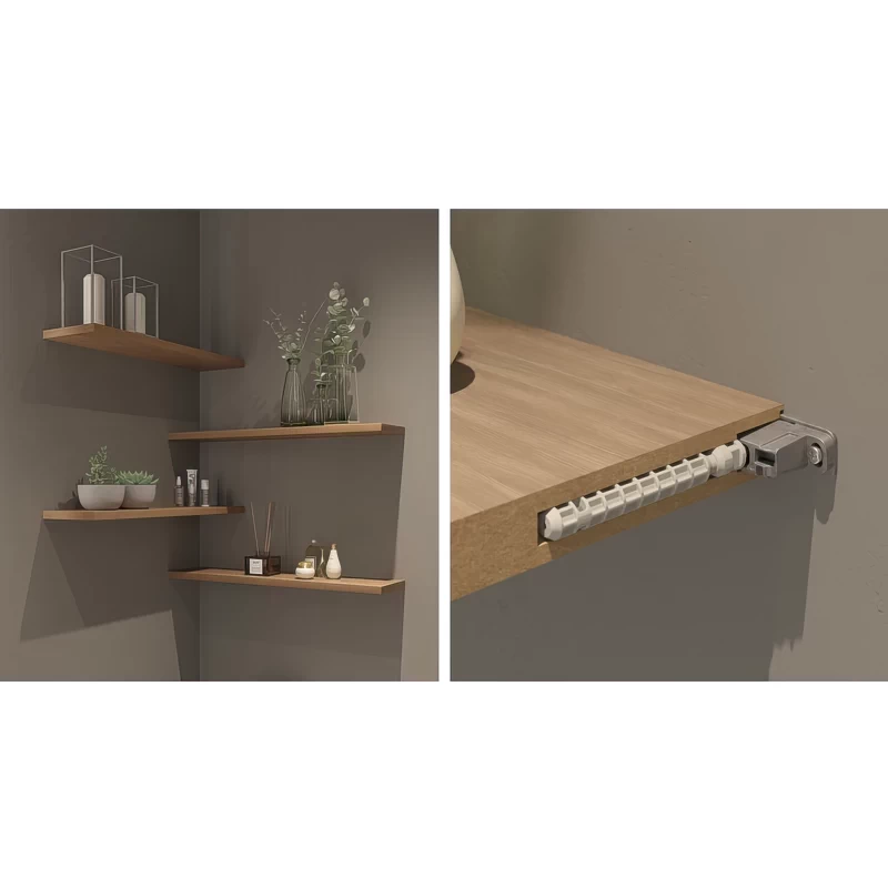 - Невидимий монтаж: Полицетримачі приховані, що дозволяє створювати стильні меблі без видимих кріплень, підкреслюючи елегантність вашого інтер'єру.
