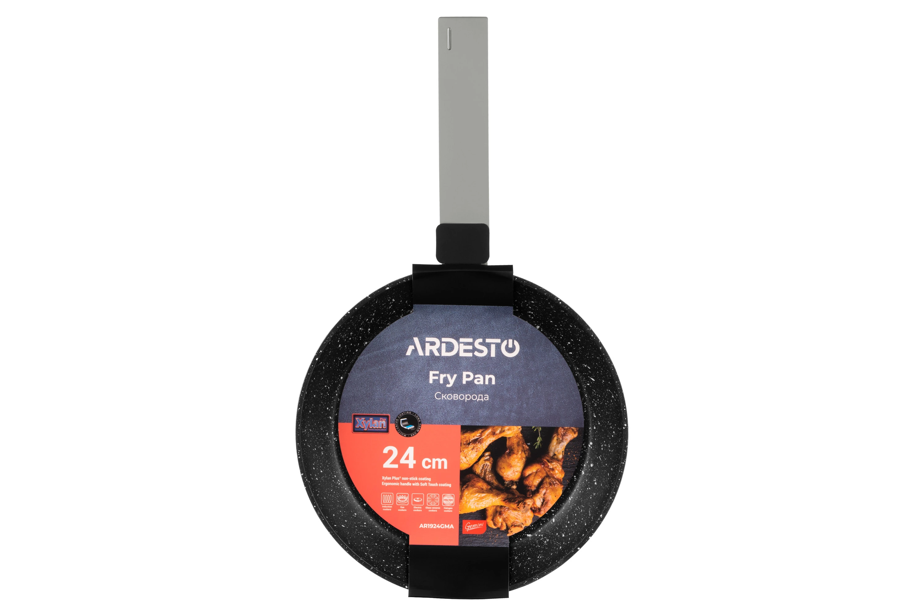 Для виробництва ARDESTO Gemini Marmo використано кований алюміній. Діаметр моделі становить 24 см. Зсередини поверхня сковороди вкрита протипригарним покриттям Xylan Plus, конструкцією передбачено soft-touch-руків’я. За висоти 4,7 см товщина бічних стінок складає 3/4 мм, а дна – 3 мм. Модель не рекомендовано мити в посудомийній машині. Сумісна з різними видами плит, а саме: електричними, склокерамічними, газовими, індукційними й галогенними.