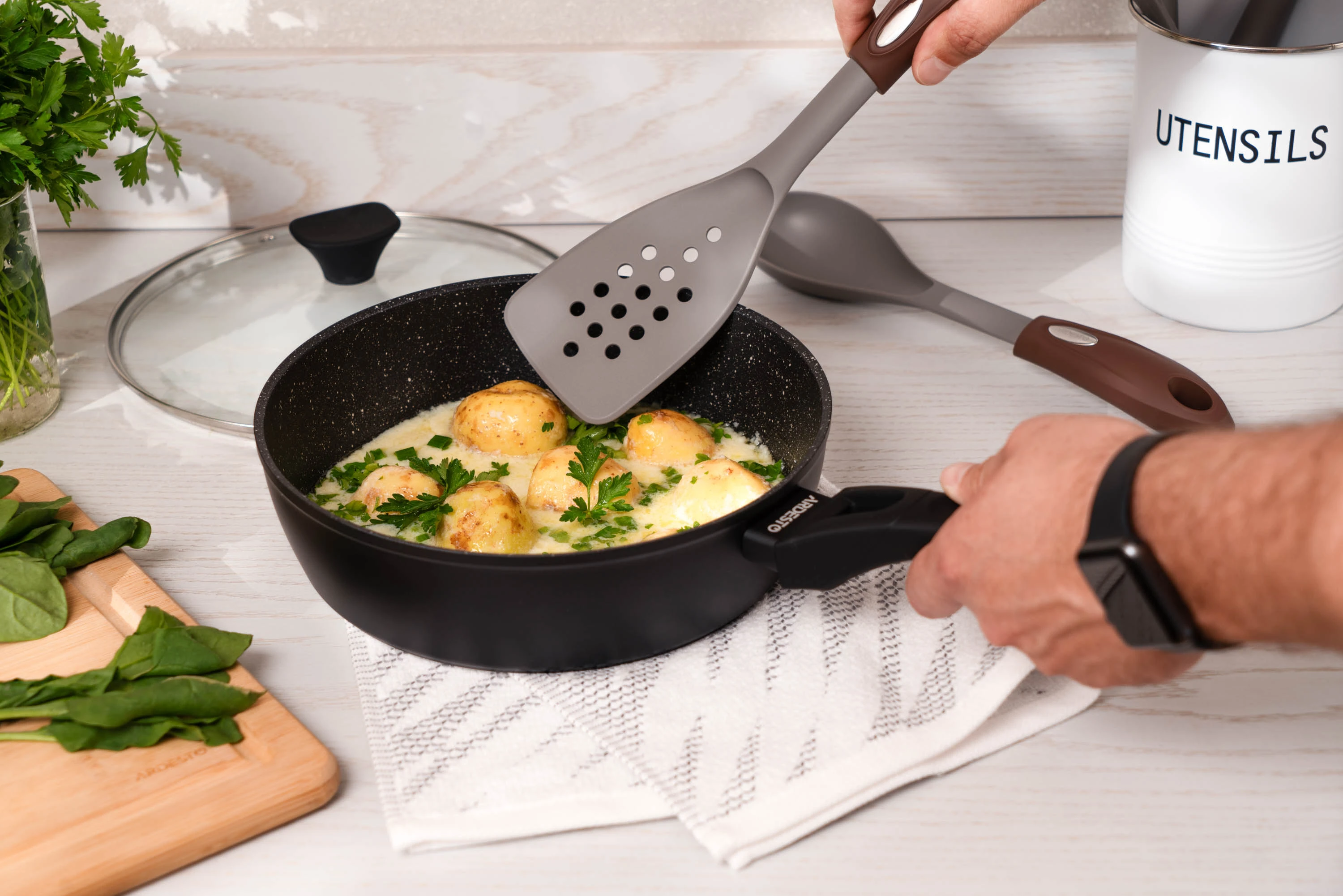 Глибоку сковороду з кришкою ARDESTO Gemini діаметром 24 см виготовлено з кованого алюмінію, який забезпечує швидке та рівномірне нагрівання. Сковороду вкрито двома шарами протипригарного покриття PPG XYLAN PLUS, тож під час приготування можна використовувати менше олії та дотримуватися здорового харчування.