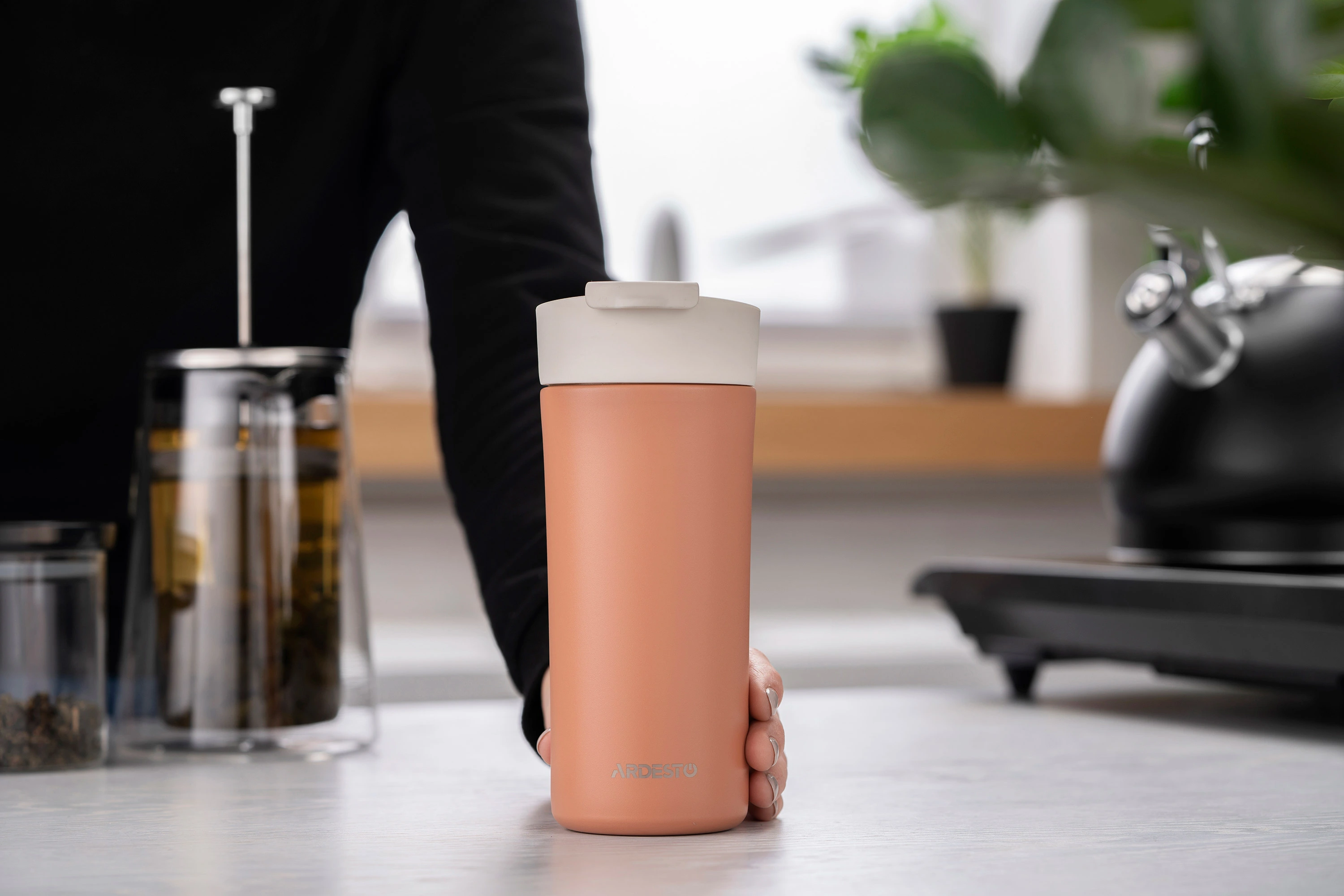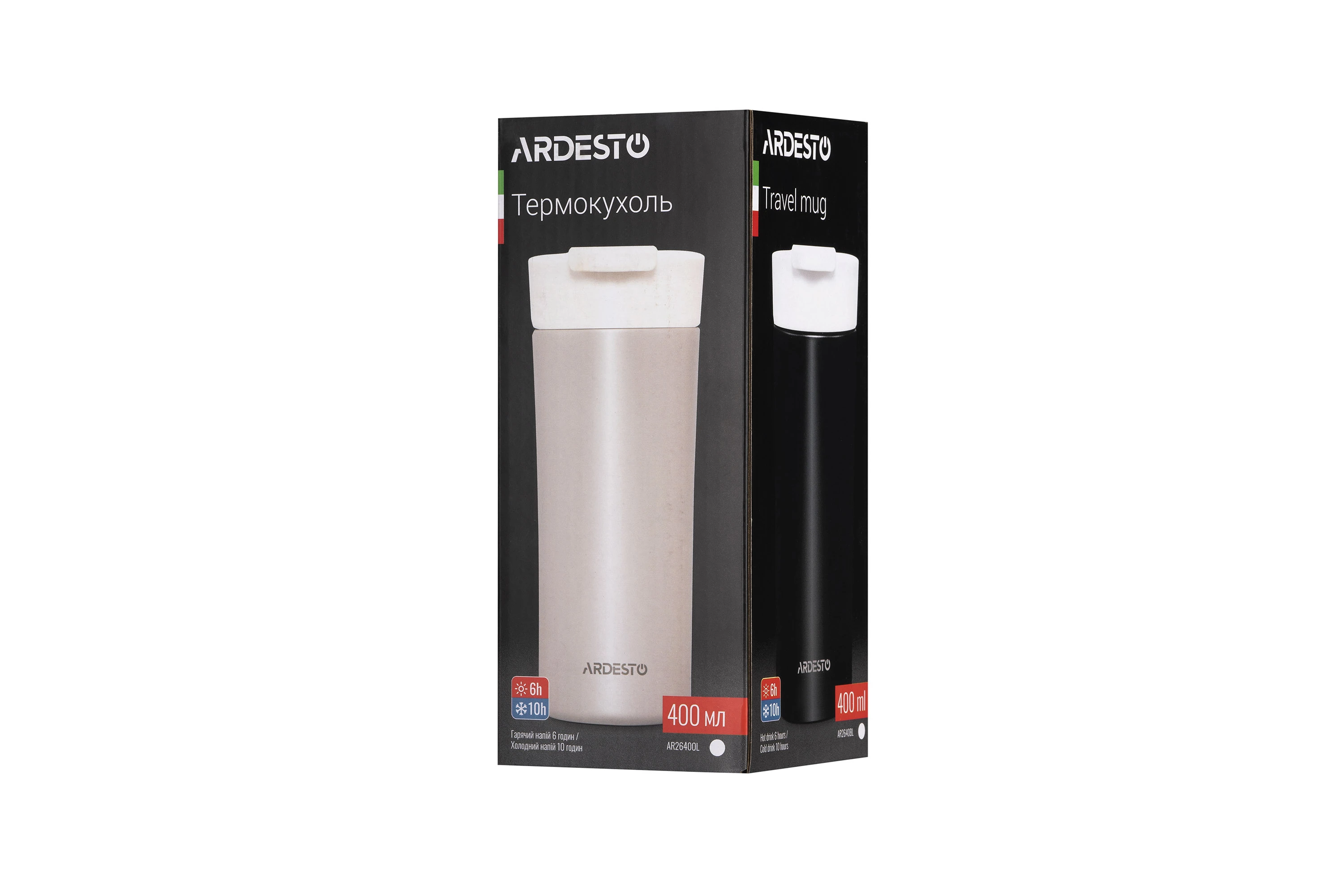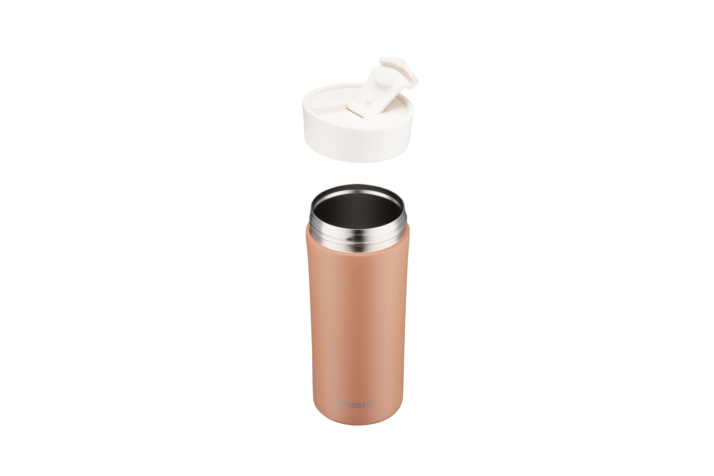 Термокухоль ARDESTO Viaggio виготовлено в ергономічному дизайні з якісної нержавіючої сталі. Механізм відкривання термокухля – зручна кришка-заскочка. Об’єм становить 400 мл. Термокухоль зберігає температуру гарячого напою 6 год, холодного – 10 год. Не містить BPA. Не рекомендовано мити в посудомийній машині.