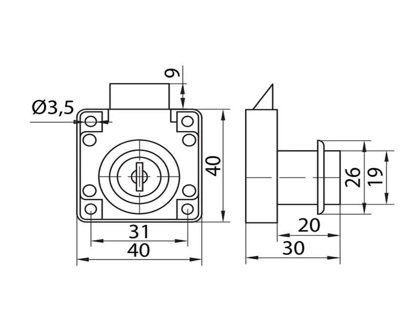 Замок призначений для врізного монтажу у меблеві фасади з ДСП або МДФ товщиною до 22 мм. Використовується для шаф, тумб, полиць, скриньок і вітрин. Засувка забезпечує щільне прилягання дверцят, а замковий механізм гарантує захист від випадкового відкривання.