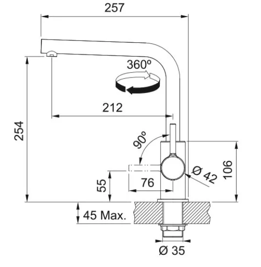 Одноважільний змішувач L-подібної форми зливом, що обертається на 360 градусів і оснащений бічним важелем керування.