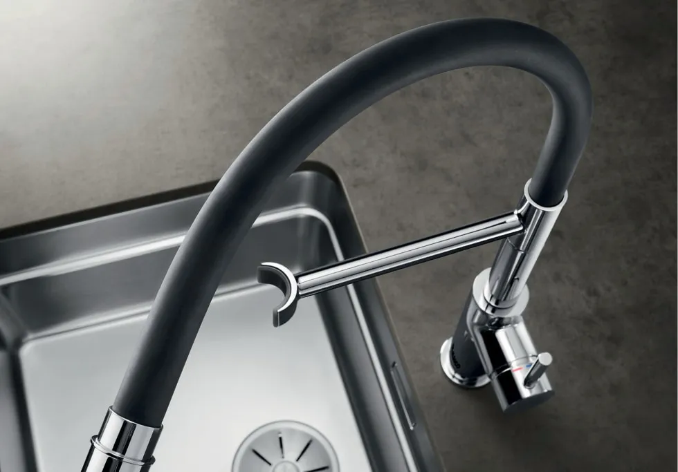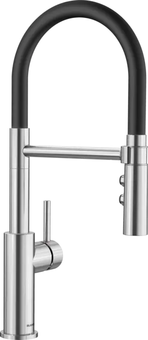 Змішувач BLANCO CATRIS-S FLEXO PVD steel. Виготовляється з високоякісної нержавіючої сталі, що забезпечить довговічність експлуатації. Напівпрофесійний дизайн з елегантними лініями, гнучкий чорний гумовий шлаг забезпечує повну свободу руху, має невелику вистоту за рахунок чого можливе розміщення під навісними шафами. Оснащений виливом з двома режимами: легке перемикання між делікатним душем та потужним струменем. Магнітний тримач забезпечує зручне кріплення виливу.