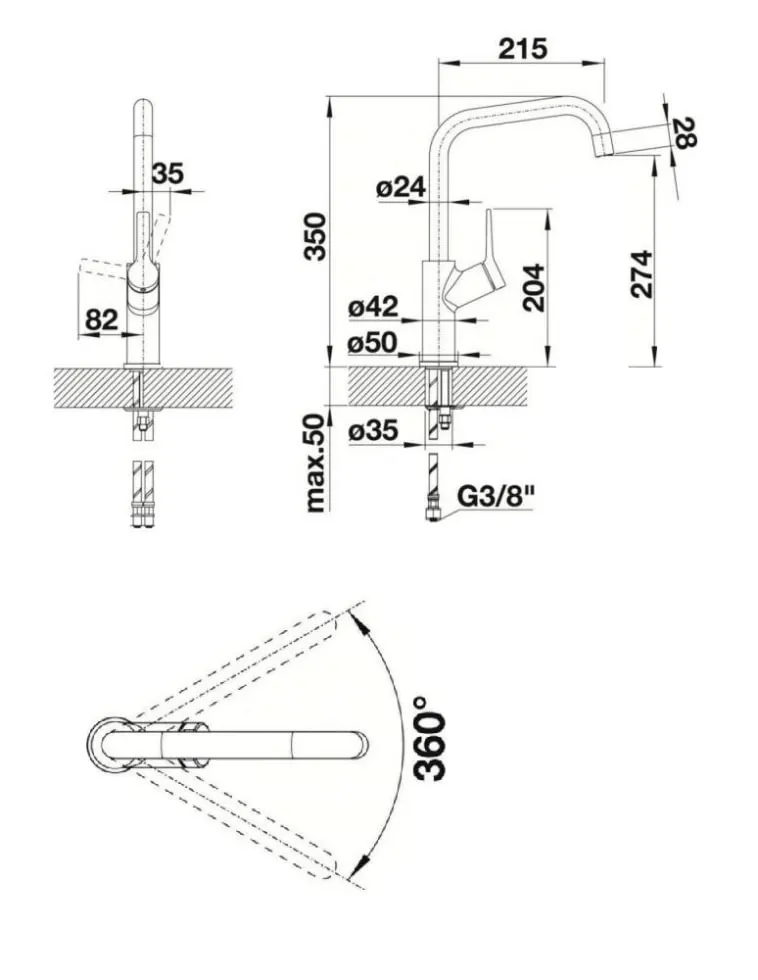 - Легке підключення гнучкими шлангами довжиною 450 мм з гайкою 3/8''