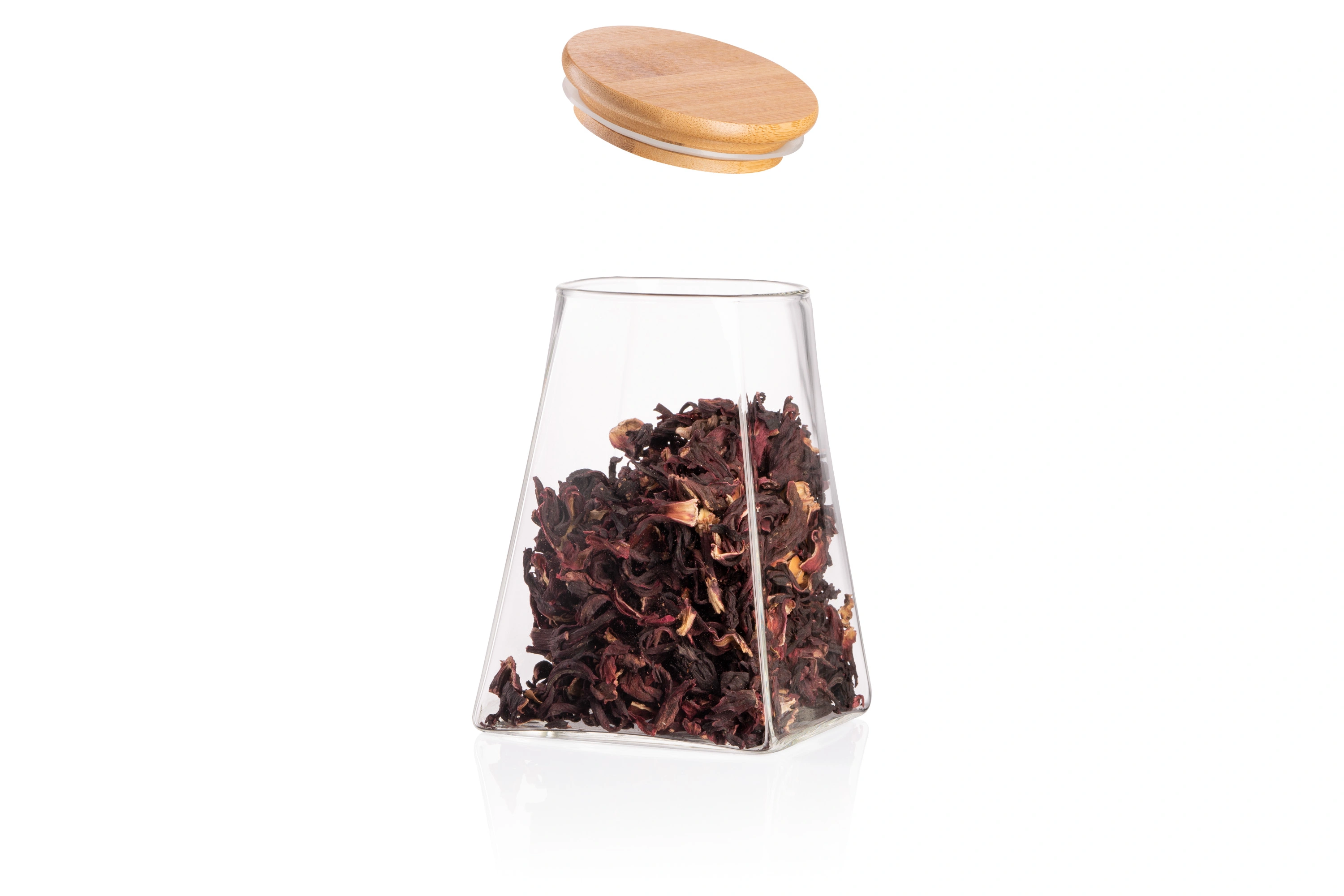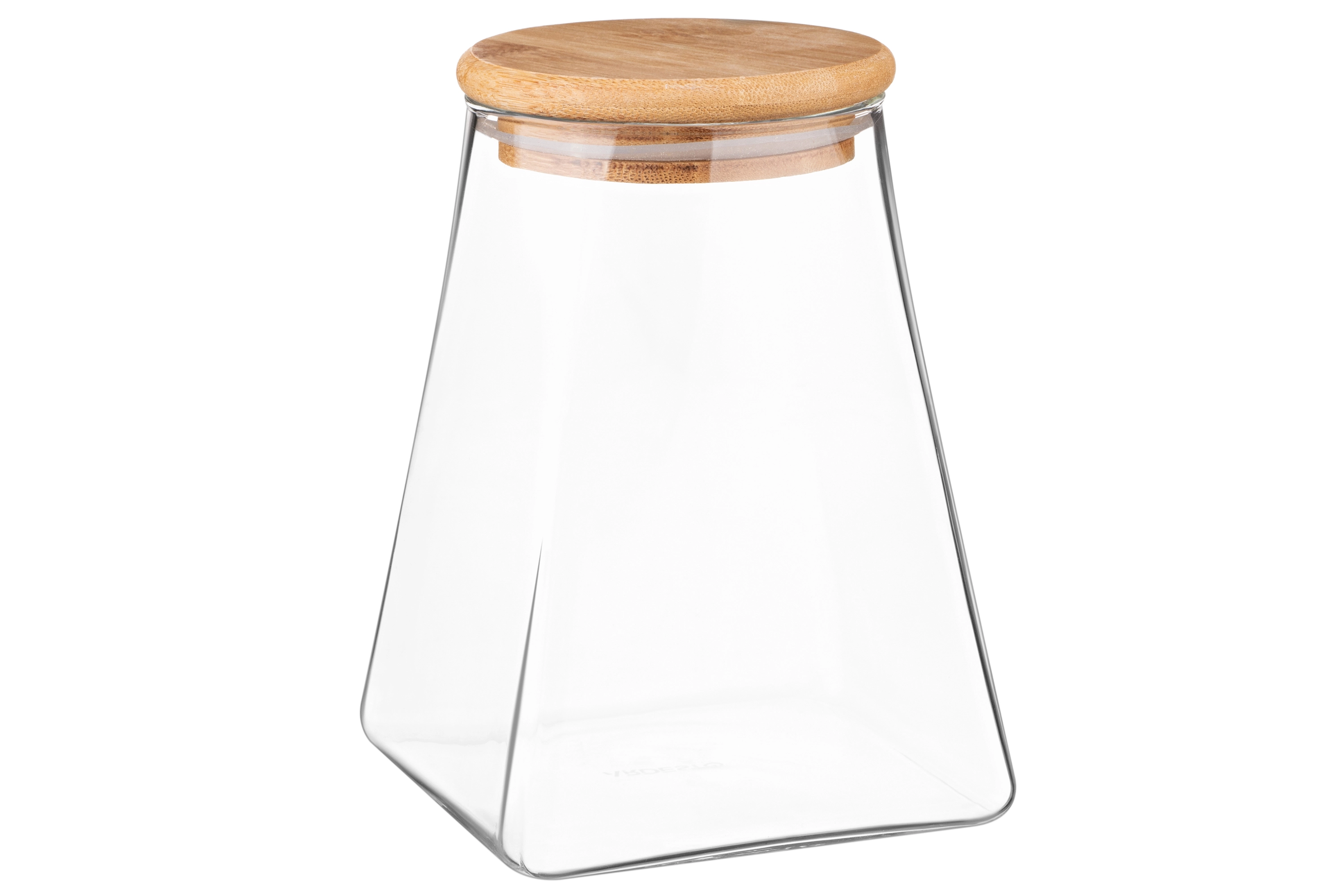 Прозора банка для зберігання з боросилікатного скла має конусну форму й об’єм 910 мл. Оснащена щільною бамбуковою кришкою. Висота – 15 см. Можна мити в посудомийній машині.