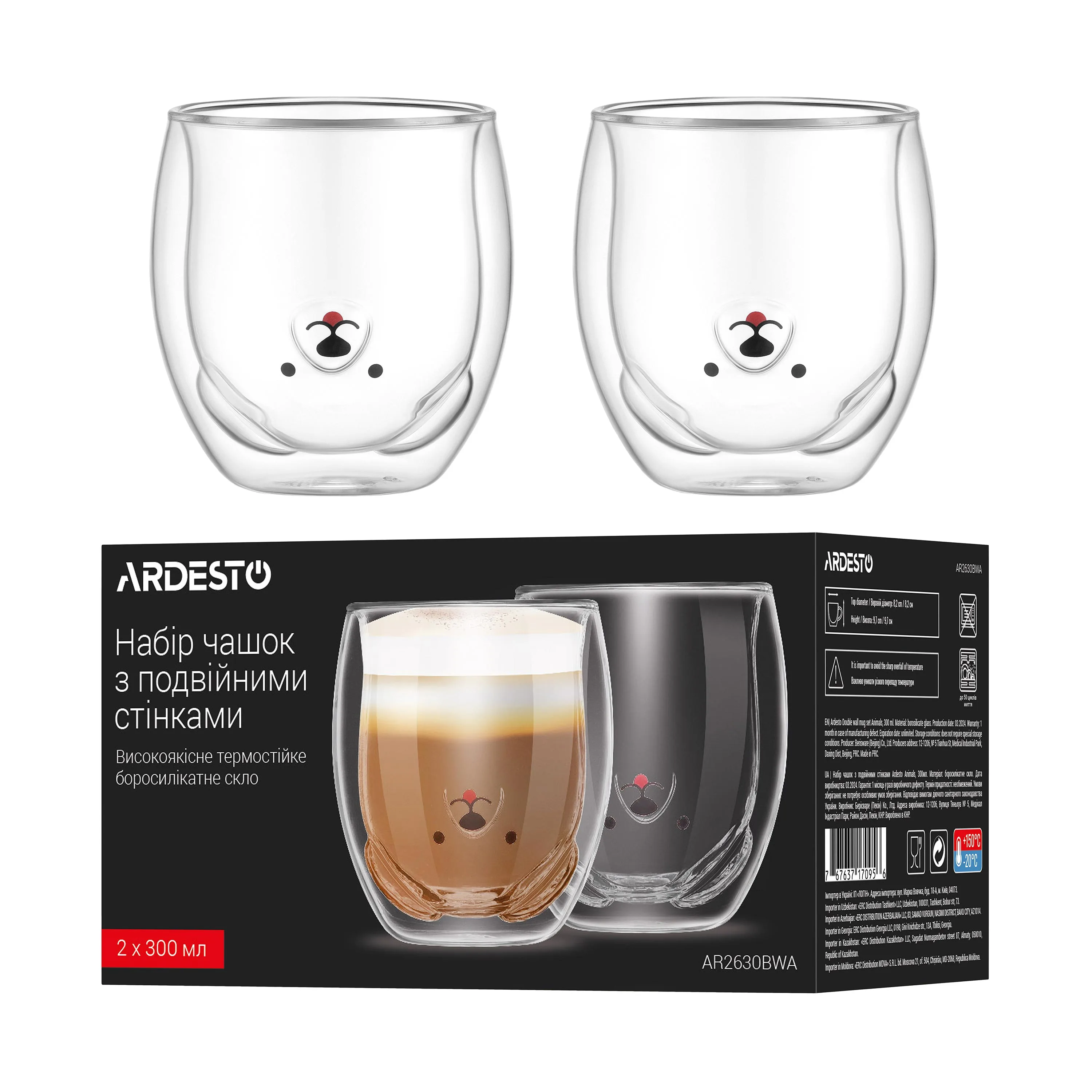 Набір чашок з подвійними стінками Ardesto Animals, 300мл, 2шт, боросилікатне скло, прозорий