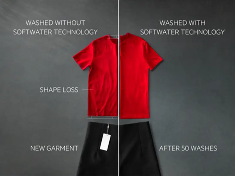 Зовнішнє тестування на стійкість кольору чорного поліестеру після 50 циклів прання за температури 30°С за технологією Softwater. Результати внутрішнього тестування свідчать про те, що завдяки технології SoftWater бавовняні речі зменшуються менше, ніж під час прання в нефільтрований жорсткий водій.