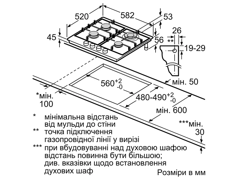 Необхідний розмір ніші для встановлення (ВхШхГ): 45 x 560-562 x 480-492 мм